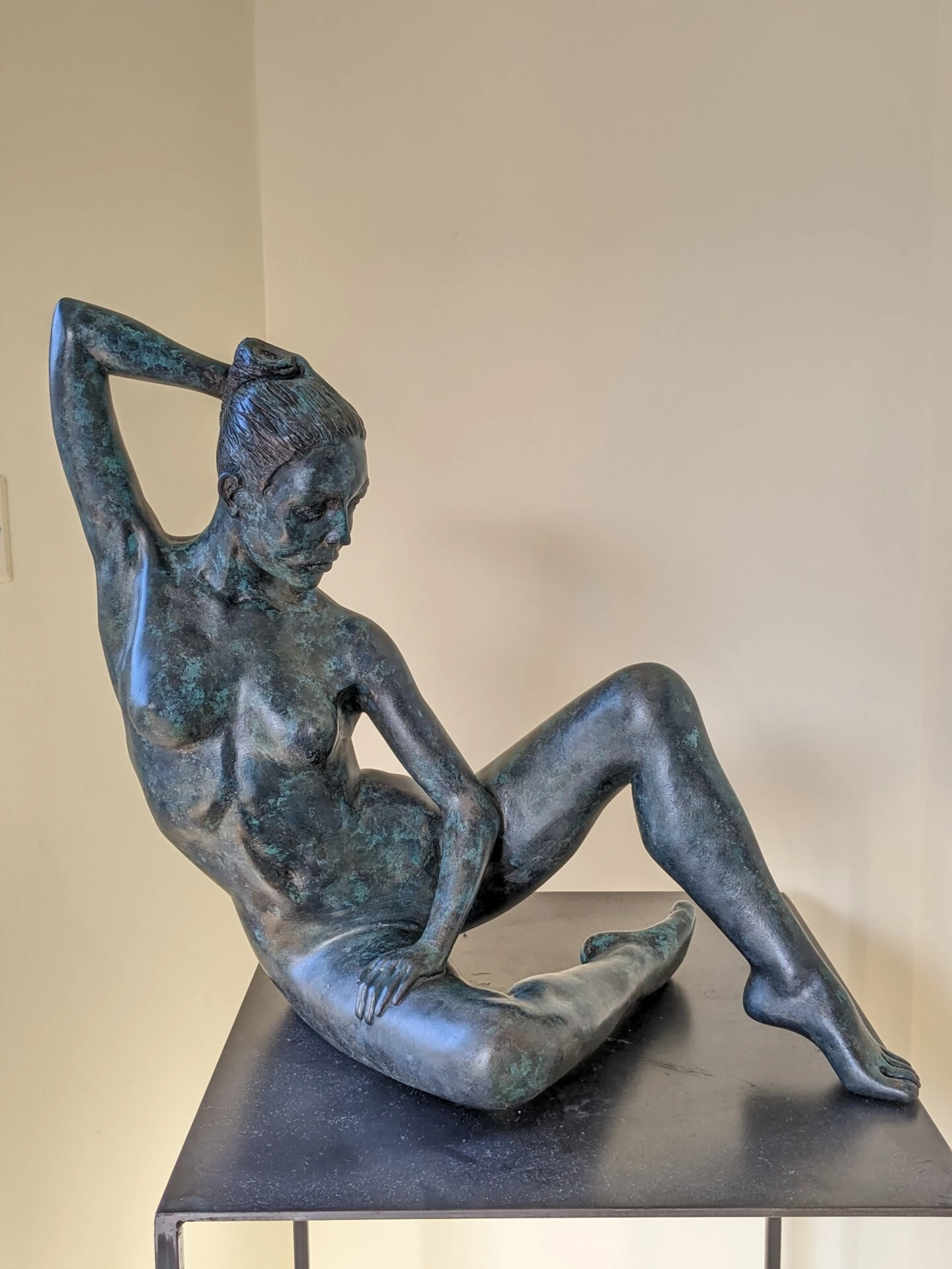 Cette sculpture est réalisée en grès blanc avec chamotte extra-fine, cuite et patinée avec différents pigments et gomme laque.